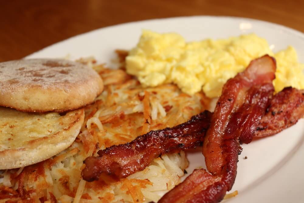 Two eggs cooked your way, hash browns, choice of bacon, sausage or chicken sausage and toast