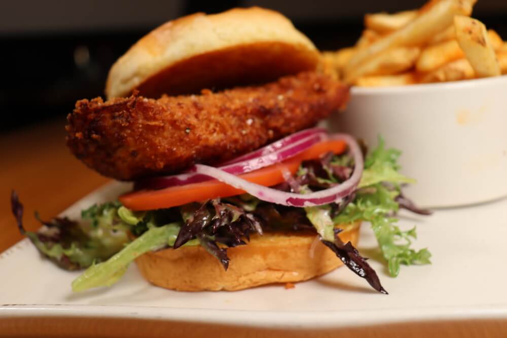 Hand-breaded chicken breast, brioche bun, spring mix, tomato, red onion, and honey mustard
