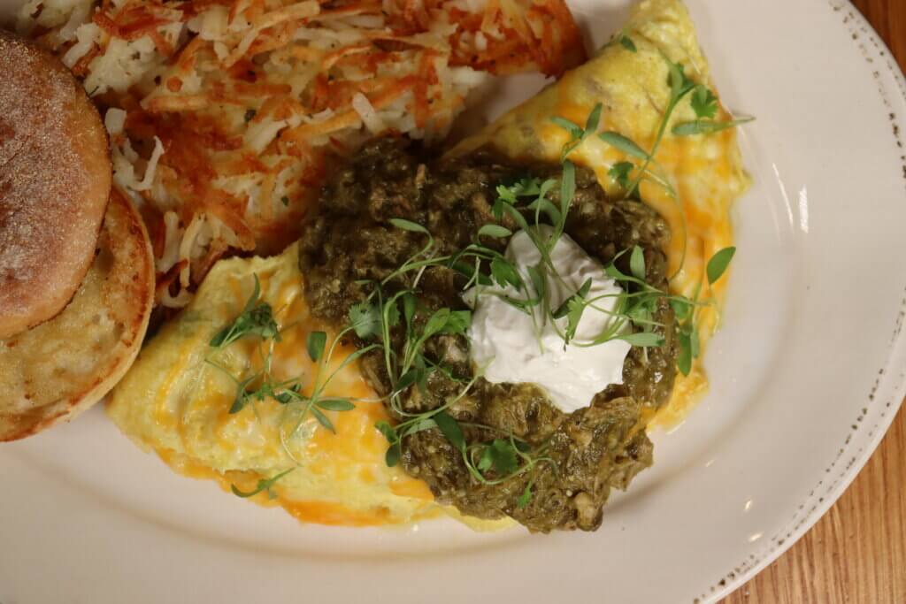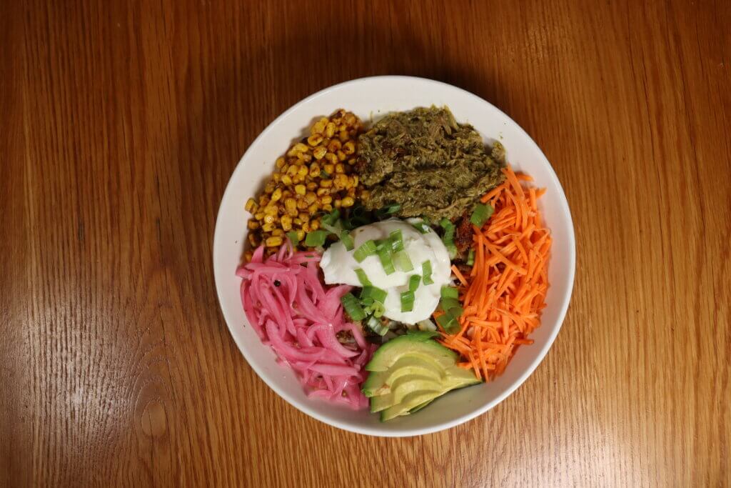 Red quinoa hash brown blend, slow roasted pork, mexican street corn, pickled vegetables, poached eggs, green onion, avocado and pork green chili